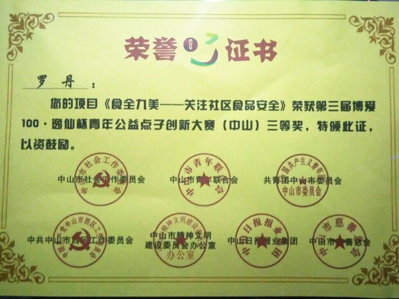 博爱100·逸仙杯青年公益创新大赛(中山)终审评审会在中山青年社会创新园落下帷幕。在大赛报名的有效期内,组委会共收到来自北京、上海、四川等15个省份及直辖市的项目作品,其中5个特等奖,10个一等奖,20个二等奖,30个三等奖。我校学生社团创益社的“食全久美”项目荣获三等奖。