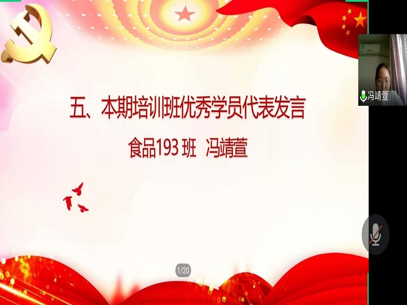 食品193班冯靖萱同学作为优秀学员代表发言。她表示内容丰富的线上党校学习使自己提高了对党的认识、进一步端正了入党动机、找到了前进方向。她代表本期培训班全体学员表示在未来的学习和生活中继续坚定理想信念,加强党的理论基础、科学文化知识和专业知识的学习,提升自身的理论素质和政治素养,以共产党员的条件和标准要求自己,争取早日站在党旗下,成为一名合格的中国共产党党员。