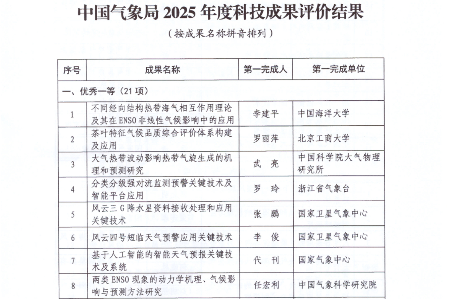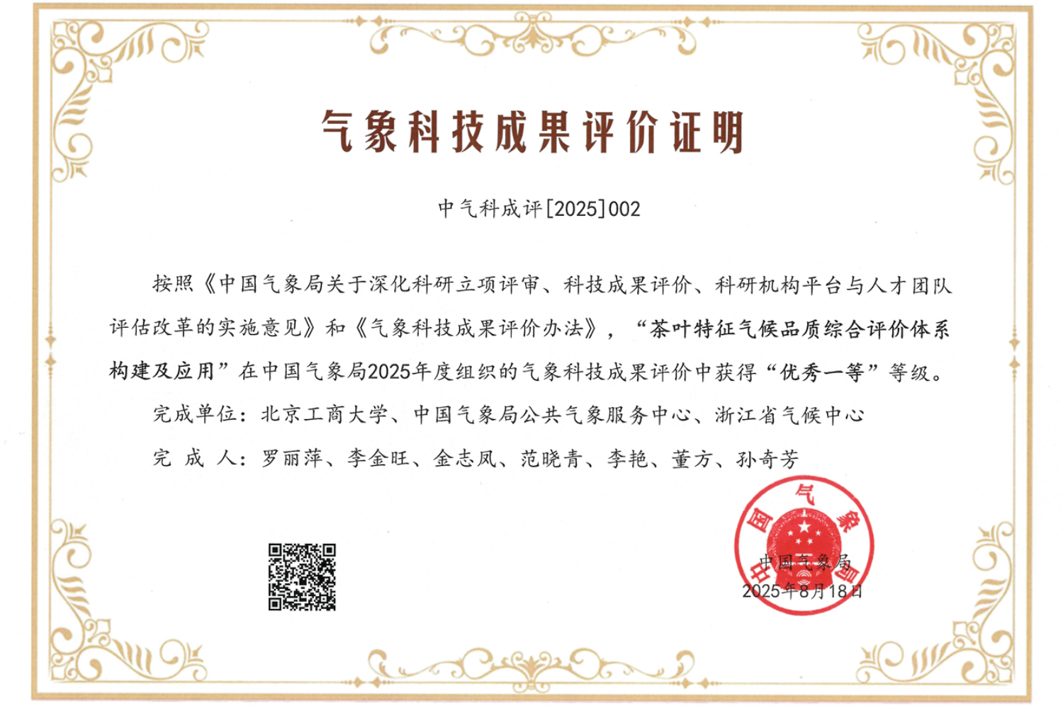近日,中国气象局公布2025年全国气象科技成果评价结果,由我校皇冠正规娱乐平台罗丽萍教授主持,依托中国气象局与皇冠正规娱乐平台共建农产品气候品质联合研究中心,皇冠正规娱乐平台、中国气象局公共气象服务中心、浙江气候中心共同完成的“茶叶特征气候品质综合评价体系构建及应用”成果,凭借对农产品气候品质研究的创新路径与成果转化国家级业务应用,在众多成果竞争中获评“优秀一等”,实现了我校在该领域的新突破。