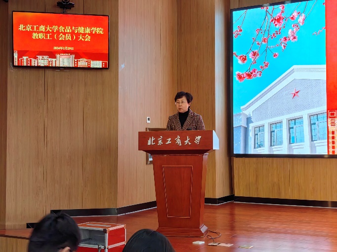 院长王彦波作了题为《固本强基、乘势而上,推动实现高质量发展新跨越》专题报告,回顾总结了学院2023年工作,高度肯定了工作成效。他从国际国内形势、区域走势、高教态势的变化切入,明确了“坚持党建引领、坚持立德树人、坚持系统观念、坚持创新发展”总体工作思路,阐明了学院2024-2027年“坚持数量指标和内涵建设同步推进”基本治理思路,对学院未来四年在学科建设、专业建设、师资队伍建设的近景及远景目标提出了可量化可考核的指标。王彦波对学院2024年重点工作和落实举措作了着重说明,强调要持续提升本科人才培养质量、筹建新的国家教学科研平台、高质量拓展国际合作、高质量促进科研转化、实施学院文化制度建设年、开展食心食意科创+系列活动等。他号召学院全体教职工“心中有数、肩上有责、腹中有谋、手上有策”,直面挑战,以“创新”引领学院发展,以“创新”破解学院难题。